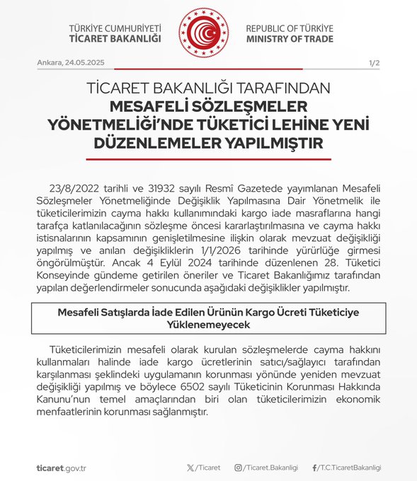 Bakanlıktan konuya ilişkin yapılan açıklamada, Resmi Gazete’nin 23 Ağustos 2022 tarihli sayısında yayımlanan yönetmelikle, tüketicilerin cayma hakkının kullanımındaki kargo iade masraflarına hangi tarafça katlanılacağının sözleşme öncesi kararlaştırılmasına ve cayma hakkı istisnalarının kapsamının genişletilmesine ilişkin mevzuatta değişiklik yapıldığı anımsatılarak, bu değişikliklerin 1 Ocak 2026’da yürürlüğe girmesinin öngörüldüğü aktarıldı.