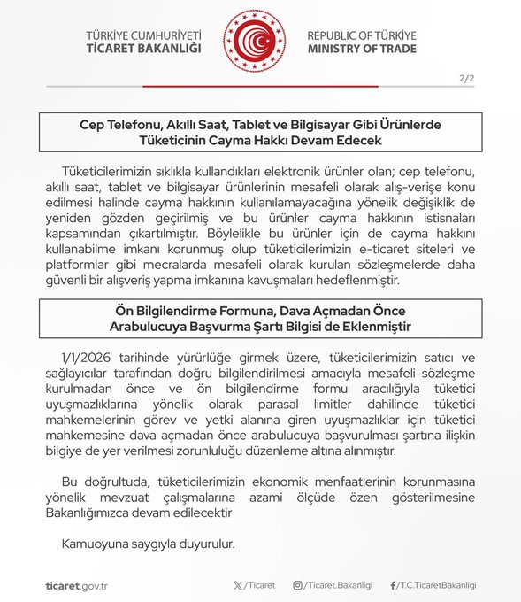 Yine 1 Ocak 2026 itibarıyla yürürlüğe girecek başka bir düzenleme ise tüketici uyuşmazlıklarında arabuluculuğa başvuru şartıyla ilgili… Buna göre, parasal limitler dahilindeki uyuşmazlıklarda mahkemeye başvurmadan önce arabulucuya başvurulması gerektiği bilgisi, mesafeli satış sözleşmesi yapılmadan önce tüketiciye sunulan ön bilgilendirme formunda yer alacak.